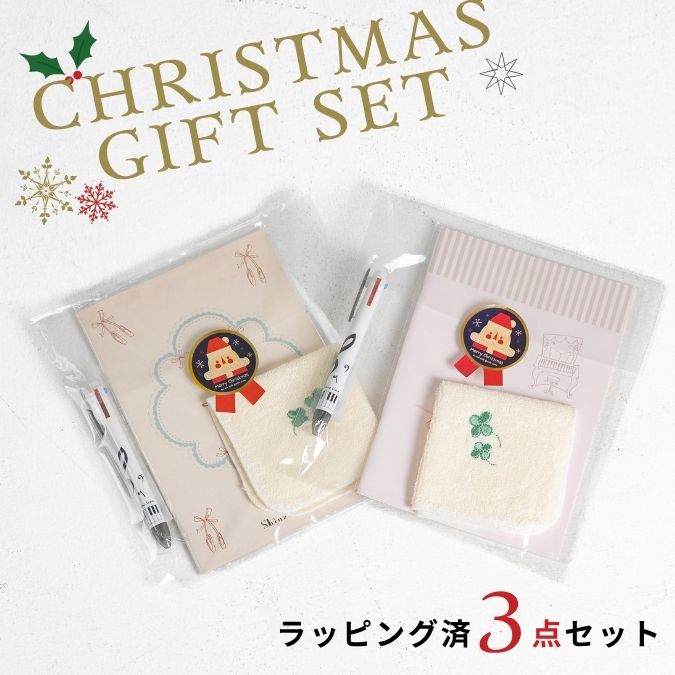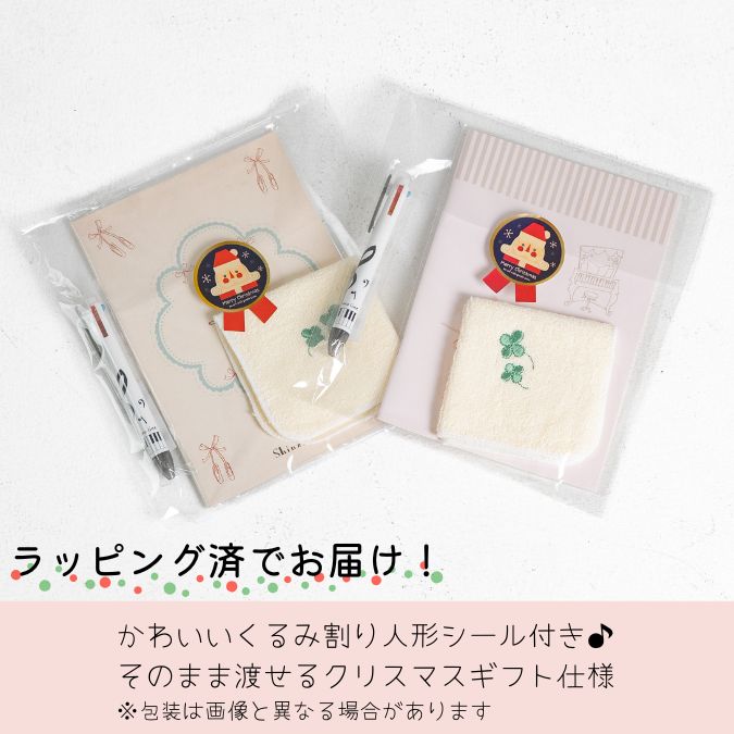 商品名:クリスマスギフト 3点セット内容:A5ノート(1冊) / ハンカチ(1枚:四葉刺繍) / 4色ボールペン(1本)