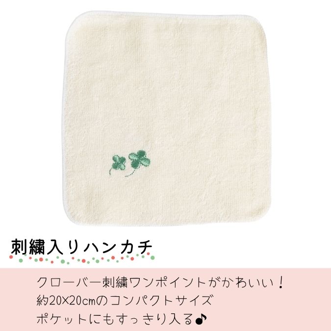 - ハンカチ(四葉のクローバー刺繍入り)ポケットに入れてもかさばらないサイズ